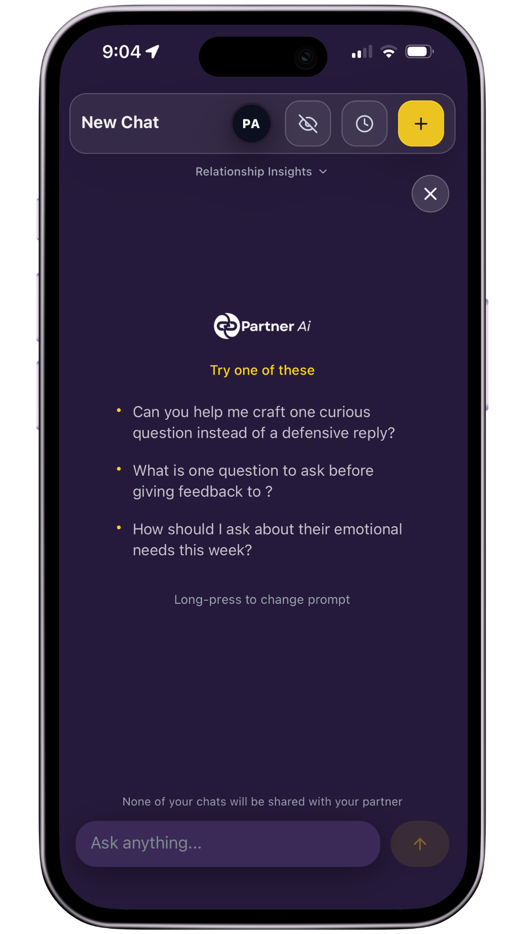Everything starts here. Your daily check-in, your Personal and Partner Chats, and your relationship pulse — all in one place.